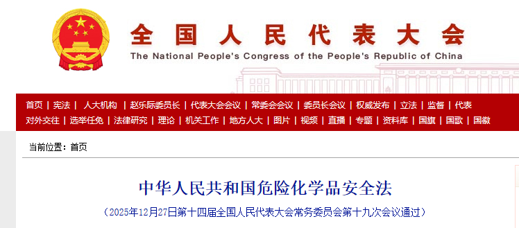 《中华人民共和国危险化学品安全法》于2025年12月27日第十四届全国人民代表大会常务委员会第十九次会议通过,自2026年5月1日起施行。