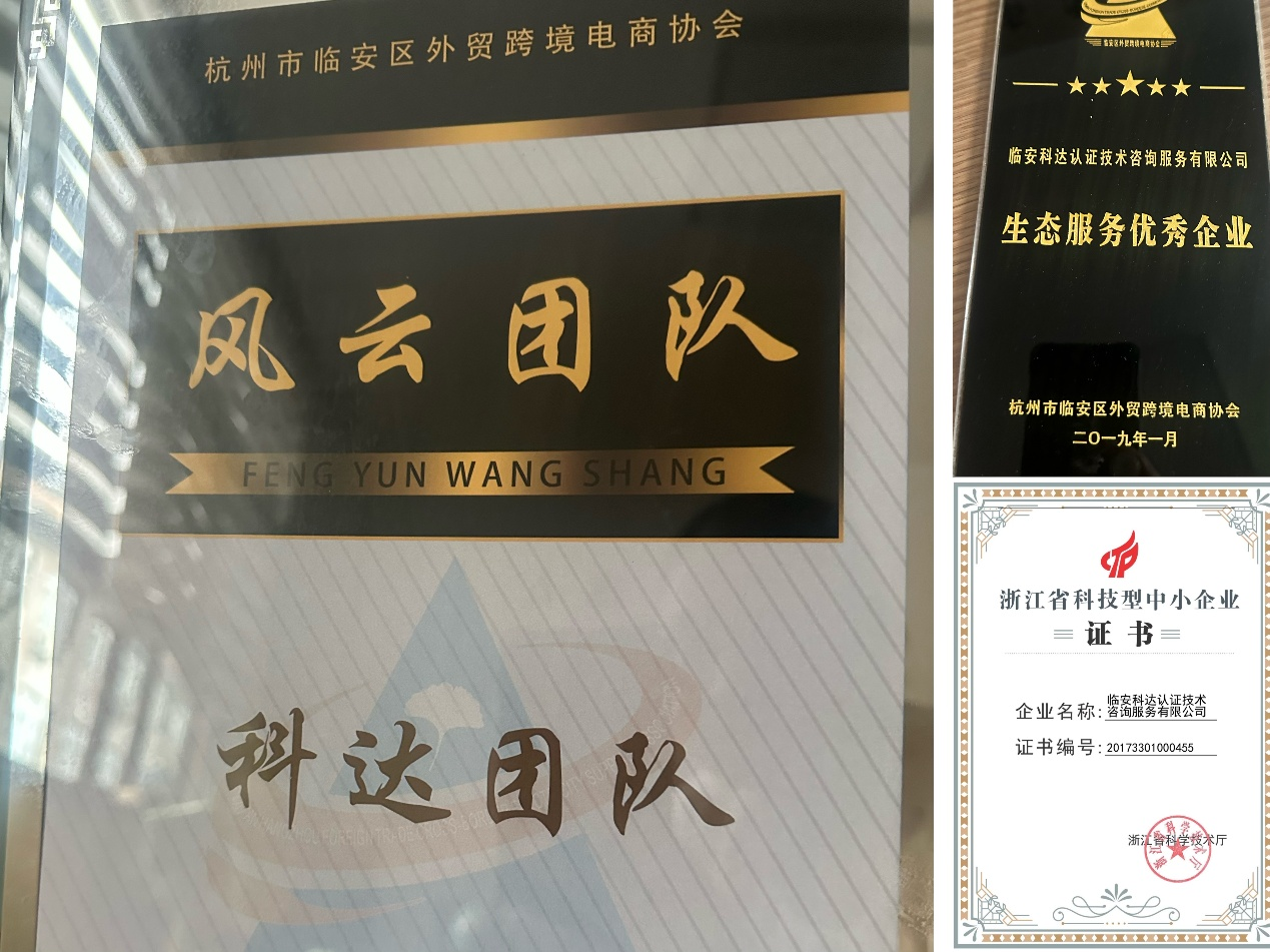 临安科达认证技术荣获省级科技型企业,杭州市临安区跨境电商协会授予“风云团队”称号,杭州临安区外贸跨境电商协会授予“生态服务优秀企业”等荣誉称号。
