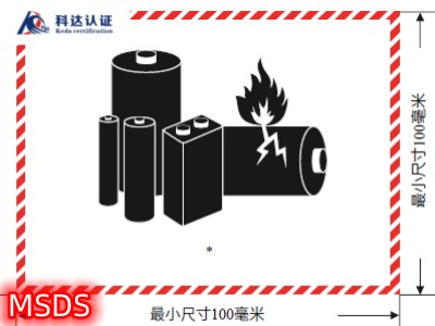 标记应为长方形或正方形,边缘为影线。尺寸最小100 毫米宽 x 100 毫米高,影线的宽度至少为5 毫米。符号(一组电池,一个已经损坏、冒火,放在锂离子或锂金属电池组或电池的联合国编号上方)为黑色,白底或适当的反差底色。影线为红色。如果因包装件大小的需要,尺寸可减小,但不得小于100 毫米宽 x 70 毫米高。在未明确规定尺寸的情况下,所有要素都应与图式比例大致相当。