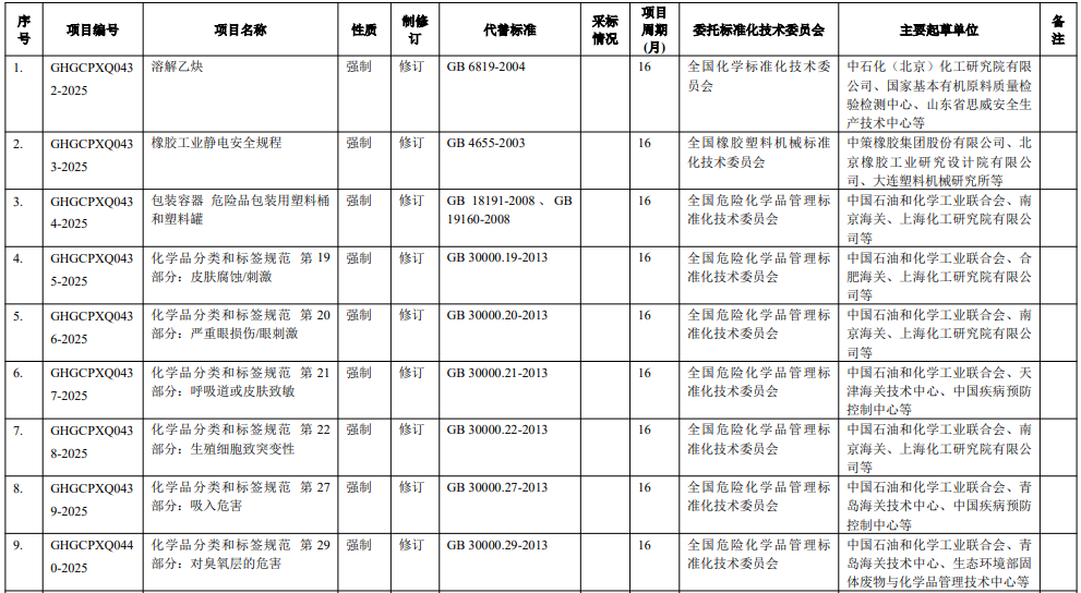 目前UN GHS已更新到第十一版,在2025年12月13日,国家工信部发布“关于公开征集《溶解乙炔》等16项强制性国家标准制修订计划项目意见的公示”,里面包含以下项目: